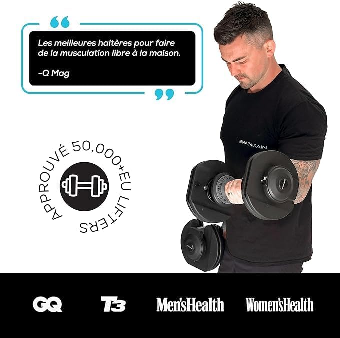 Passez facilement de 2,5 kg à 24 kg grâce aux innovants haltères réglables BrainGain de 24 kg. Plus besoin de 30 poids séparés.