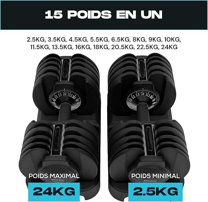 Les haltères ajustables BRAINGAIN 24 kg équivalent à 15 haltères fixes individuels.