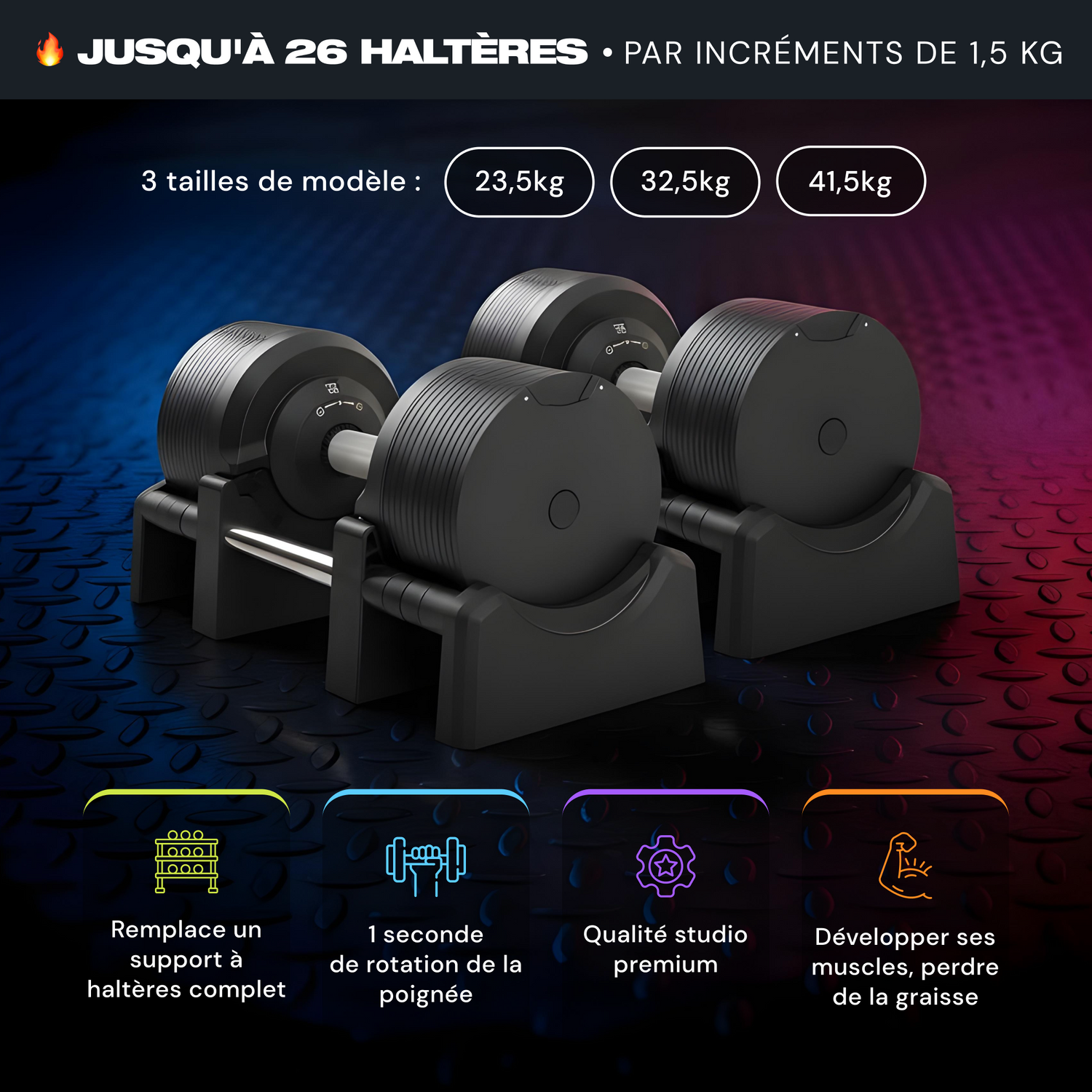 Découvrez les principales caractéristiques de notre Haltères Réglables Noirs (Paire) en cliquant sur les points forts animés.